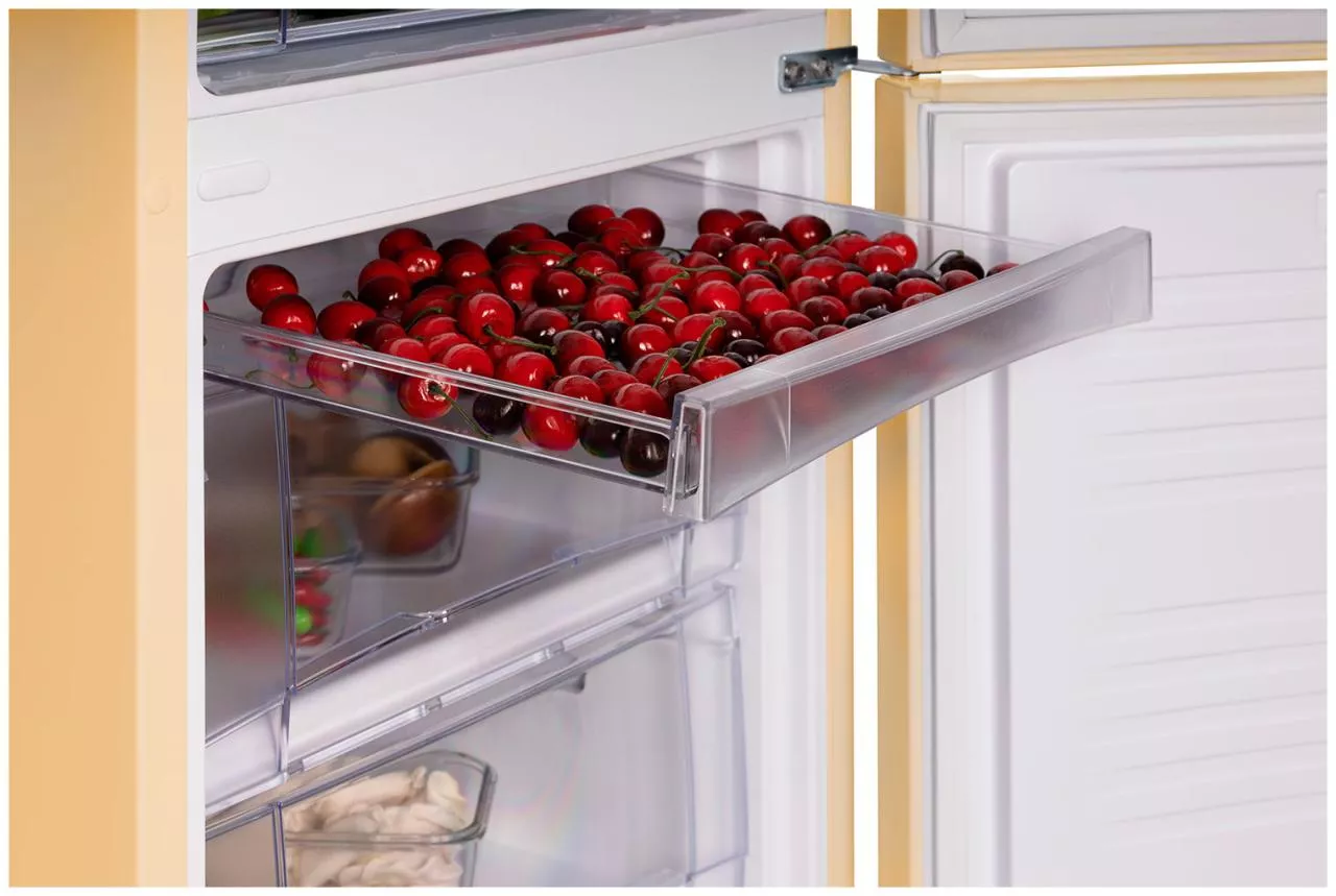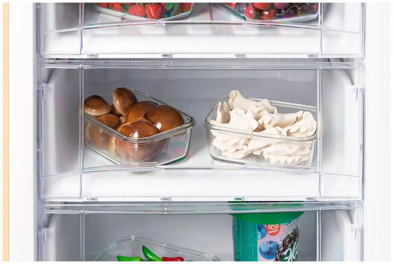 - 3 прозрачных ящика в морозильном отделении позволяют поместить и длительно хранить большие куски мяса, курицу, полуфабрикаты и другие объемные замороженные продукты;
