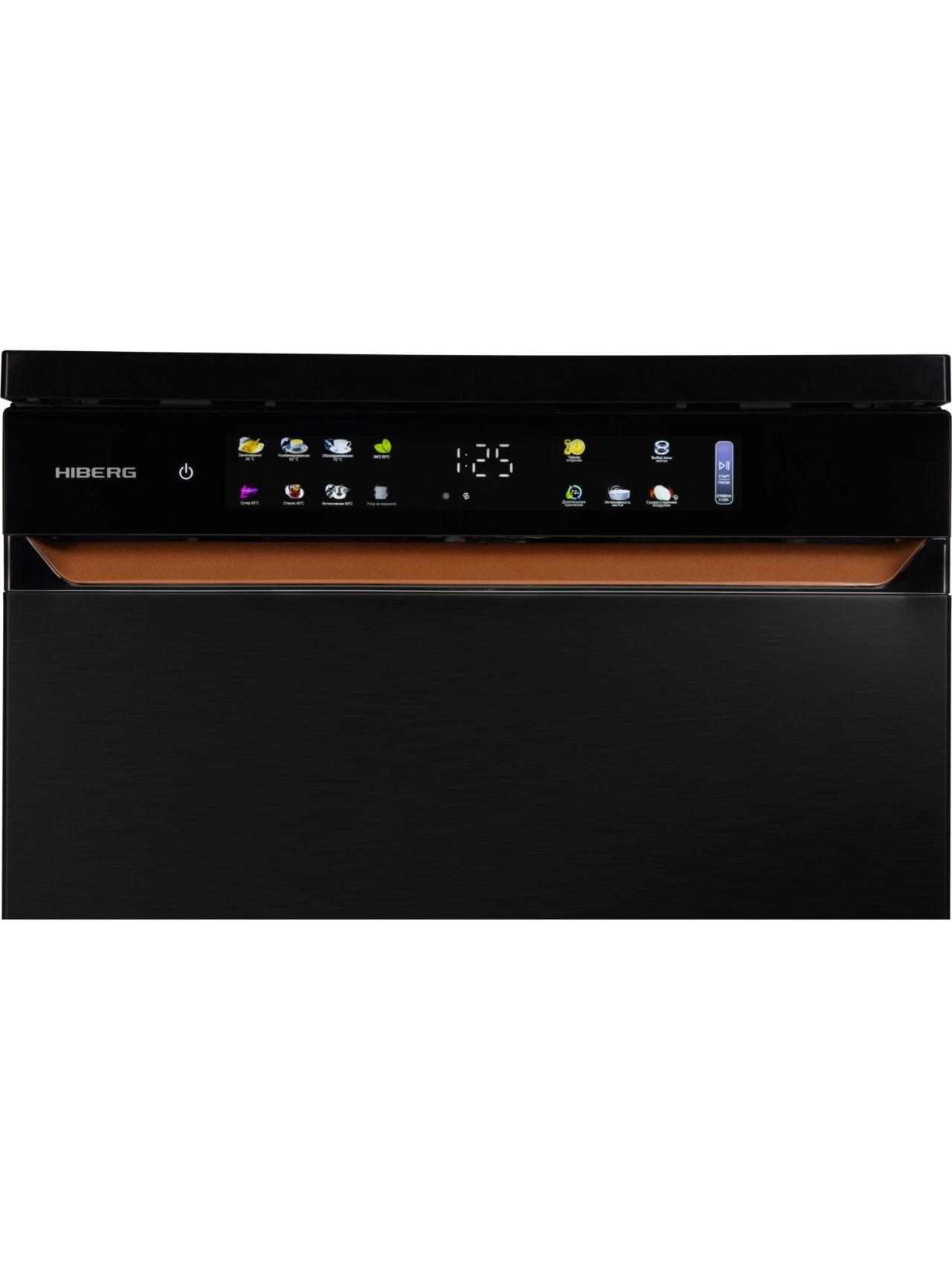 Для комфорта предусмотрены выбор зоны мытья (в одной корзине), таймер отсрочки, цветная сенсорная панель с большим дисплеем. Премиальный дизайн подчеркнут стильными кожаными вставками и единой стилистикой со стиральной машиной HIBERG I-DDQ10-814 B. За безопасность отвечают полная защита от протечек AquaStop и блокировка от детей. Гарантия — 2 года.