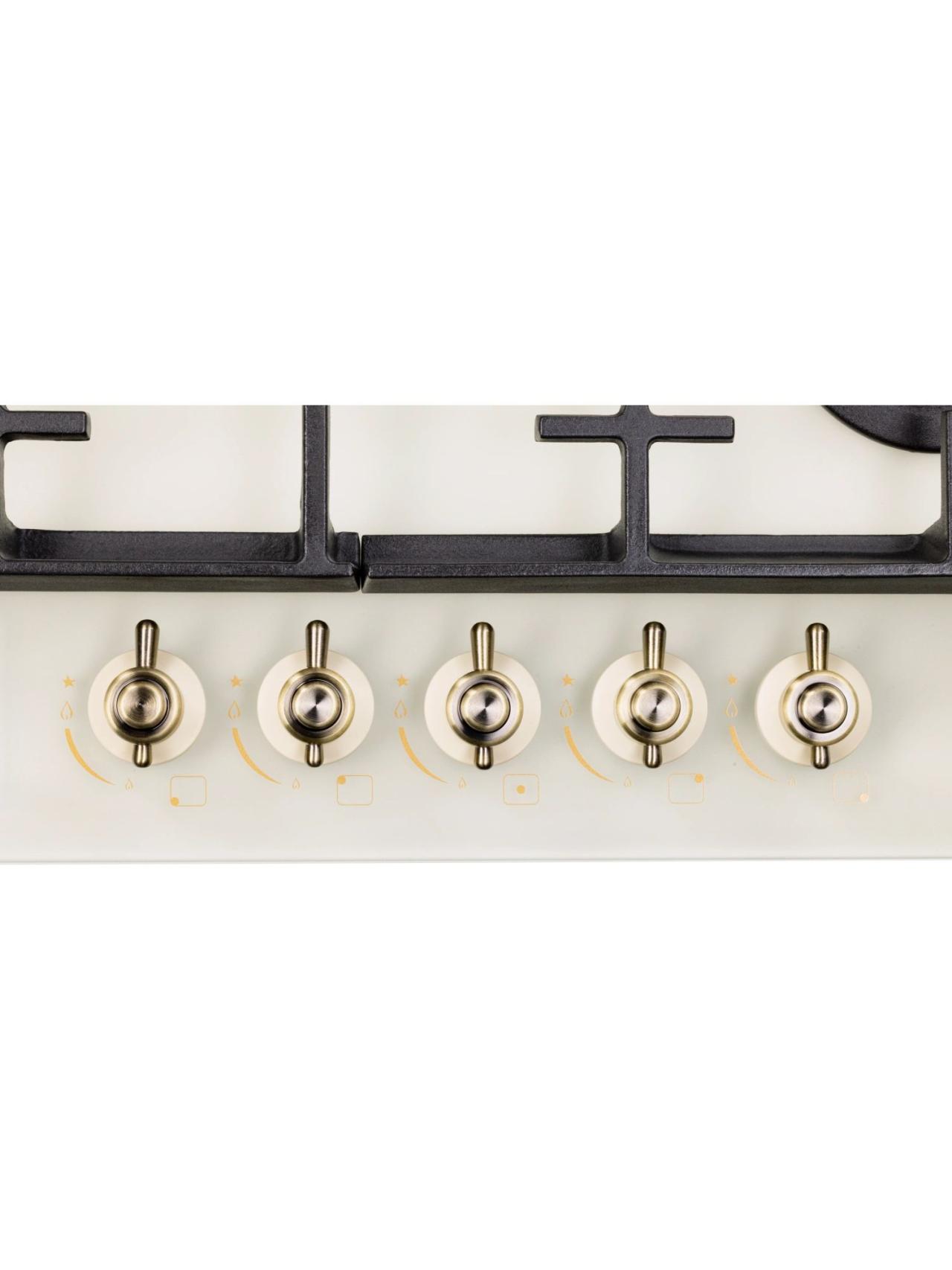 Пять конфорок газовой варочной панели отличаются диаметром и мощностью. Дополнительная горелка позволяет готовить еще больше блюд одновременно. Самая большая конфорка – WOK с тройным рядом пламени и мощностью 3,4 кВт. Усиленный жар способен быстро нагреть толстостенную глубокую посуду с небольшим диаметром дна для приготовления азиатской кухни. Также на ней можно быстро вскипятить воду, ускорить процесс жарки мясных и рыбных блюд до хрустящей корочки при добавлении небольшого количества жира.