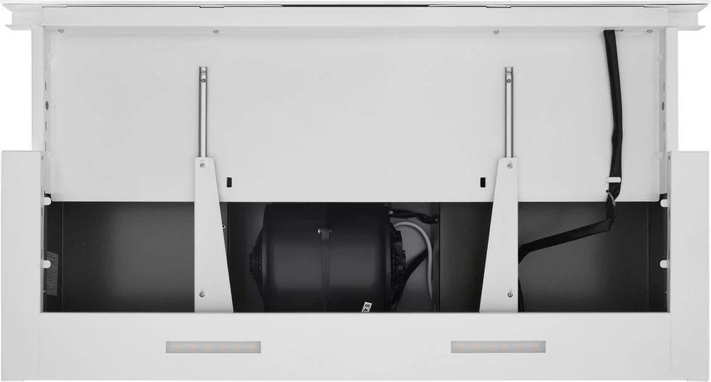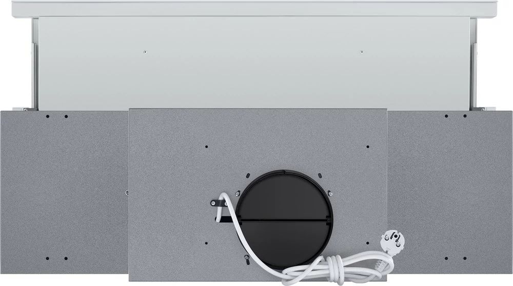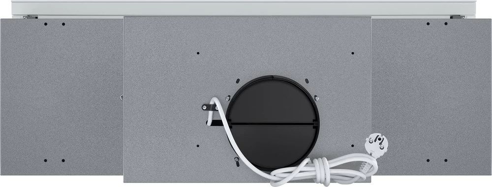 Встраиваемая вытяжка из высококлассной стали, передняя планка отделана тонированным стеклом, встраивается в шкаф над поверхностью плиты. Благодаря выдвижному козырьку она эффективно собирает загрязненный воздух над плитой.
